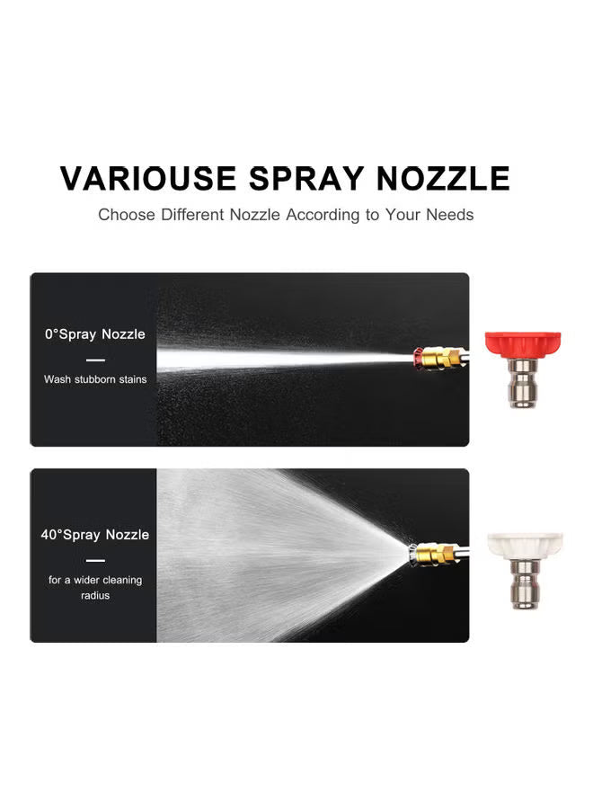 - RICH PRESSURE NOZZLE -- Come with a 0°nozzle for long and powerful rinse or garden watering, and a 40°nozzle for wide range car suface washing, quick and effortless car cleaning.
